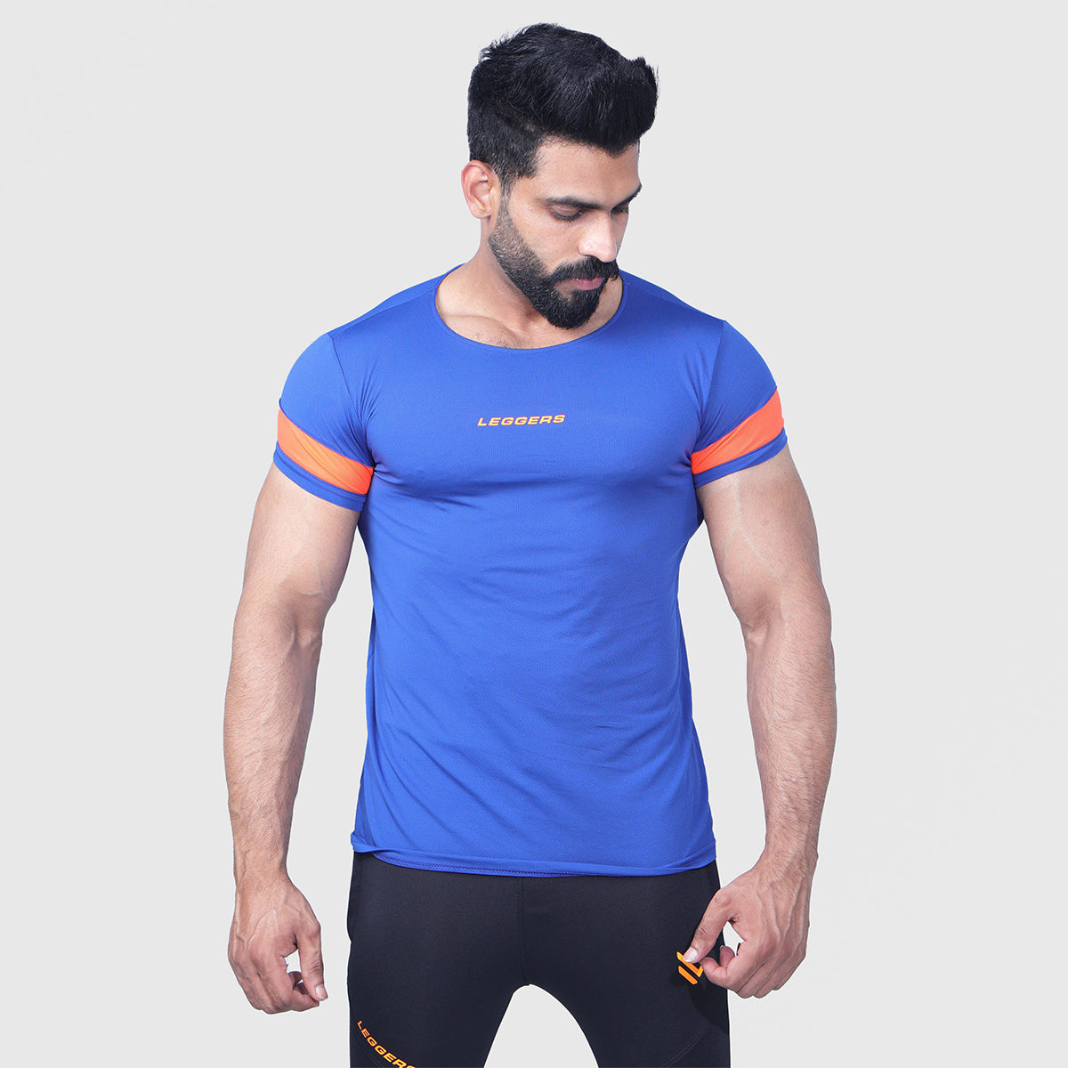 Elevate your workout experience with our Gym Blue Half Sleeve Shirt featuring a striking orange shoulder panel and wide neck style.