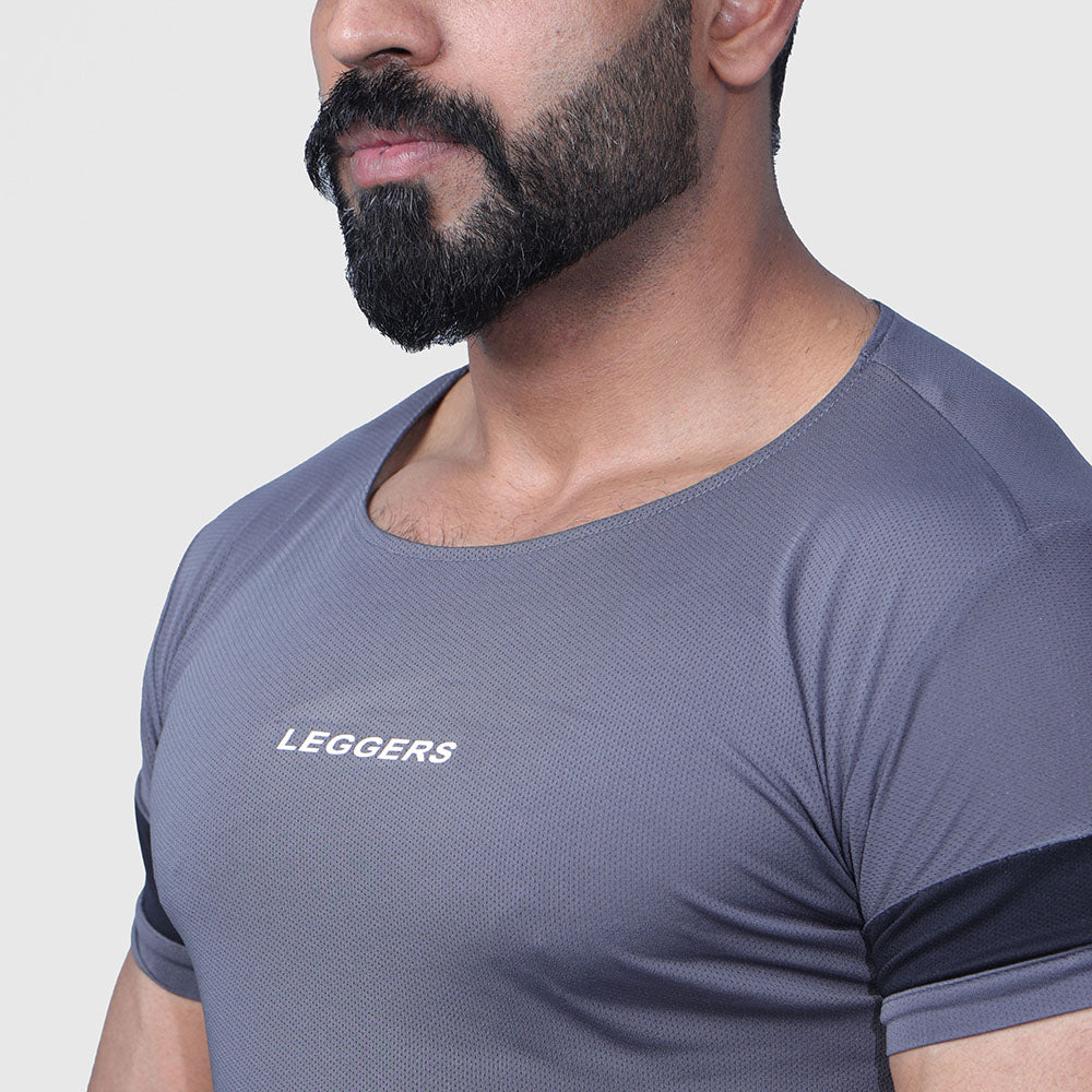 Elevate your gym sessions with our Gray Wide Neck Half Sleeve Shirt, featuring a sleek black shoulder panel.